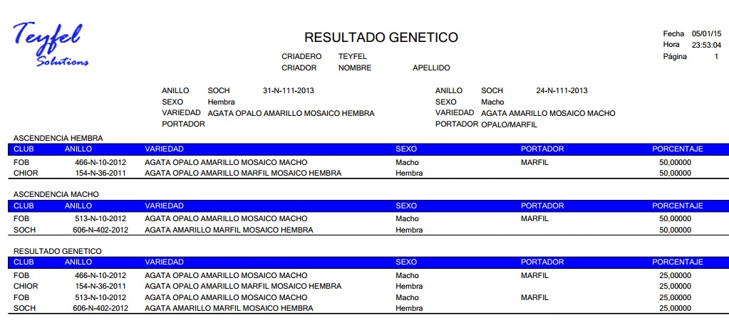 En MiCriadero.com Ud. podrá, dado una hembra y un macho, tener un informe que establezca cuál será el resultado genético porcentual de dicha cruza.